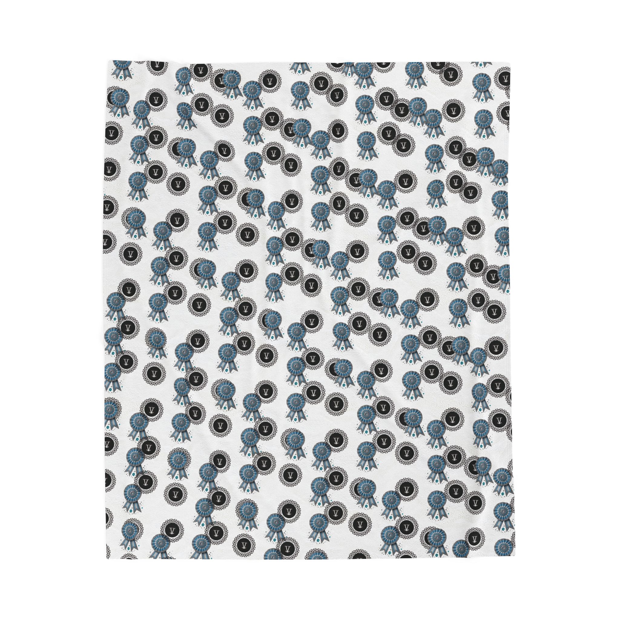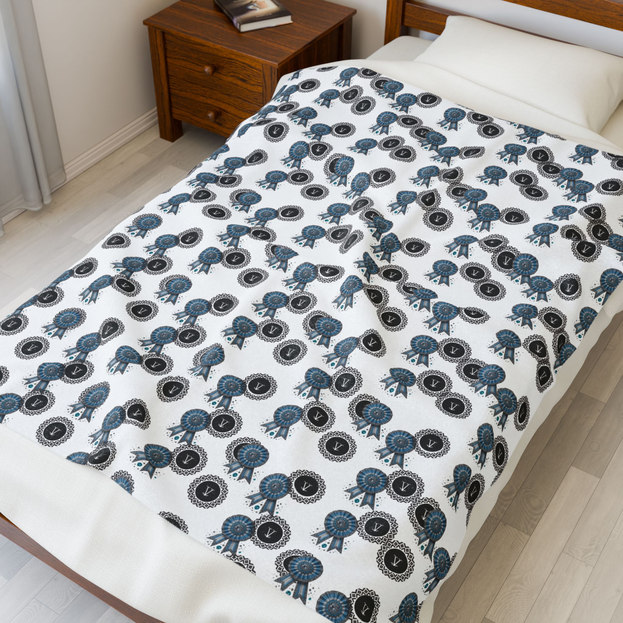 A soft throw plush blanket patterned with a repeating pattern featuring an escarapela-inspired repeat in cool blue-gray tones—cozy, graphic, and quietly iconic. Designed to bring heritage into the home in a modern way.