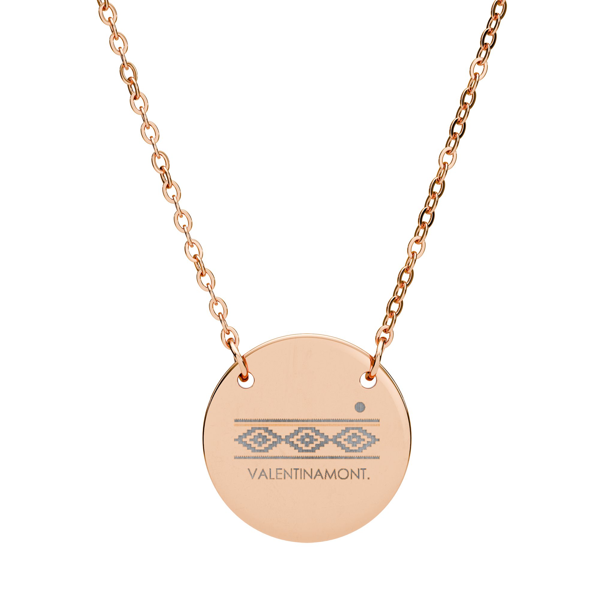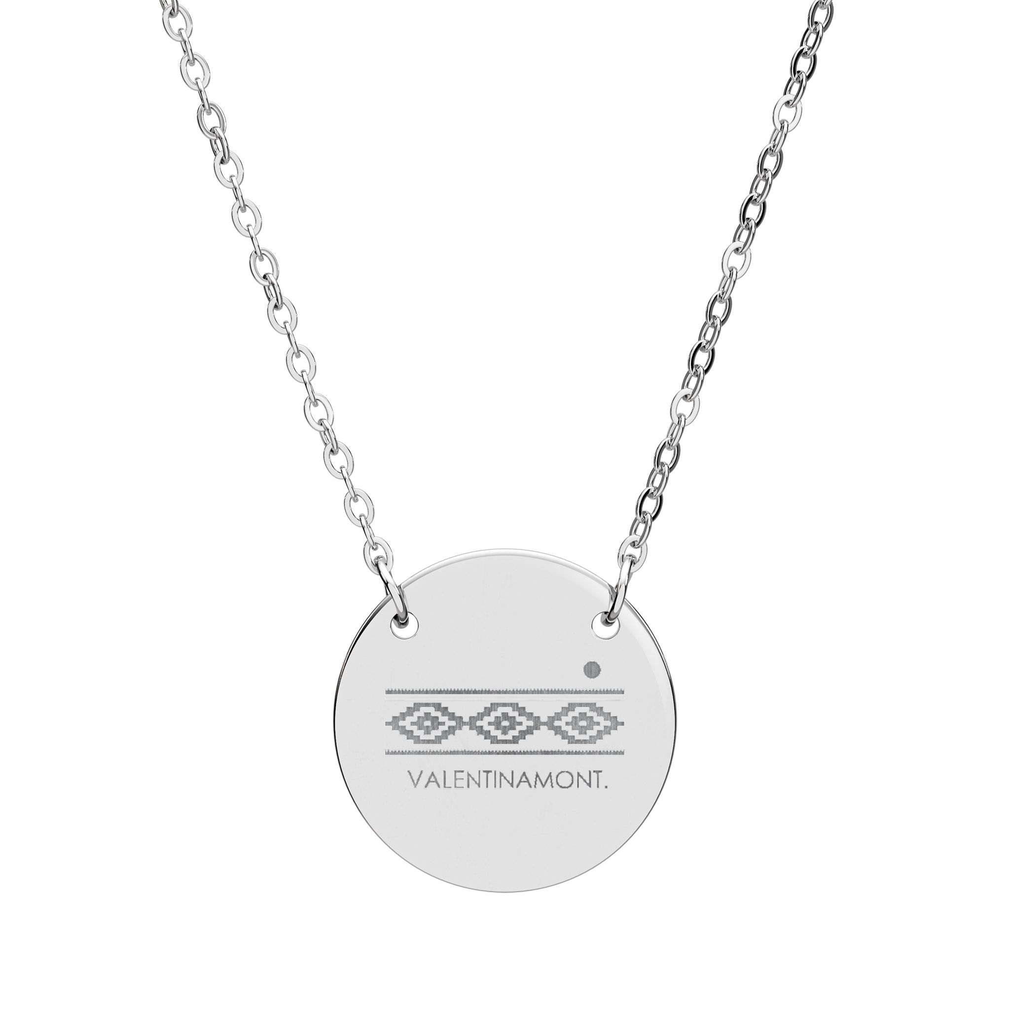 A delicate engraved circle pendant engraved with VALENTINAMONT’s signature with a pampa geometric design as a subtle nod to Argentine identity, reimagined with a modern, polished finish. A quiet statement piece made for everyday layering. The small 18mm disc hangs from a fine chain, its laser-etched geometric motif catching light like a tiny, personal emblem. Lightweight and hypoallergenic, the piece slips into everyday life — layered with other chains or worn alone beneath a collar — adding a subtle, intentional detail to moments that matter. Choose polished silver or warm rose-gold tones for a look that ages gracefully and resists tarnish thanks to surgical-grade stainless steel and PVD options.